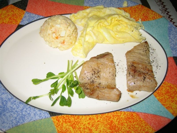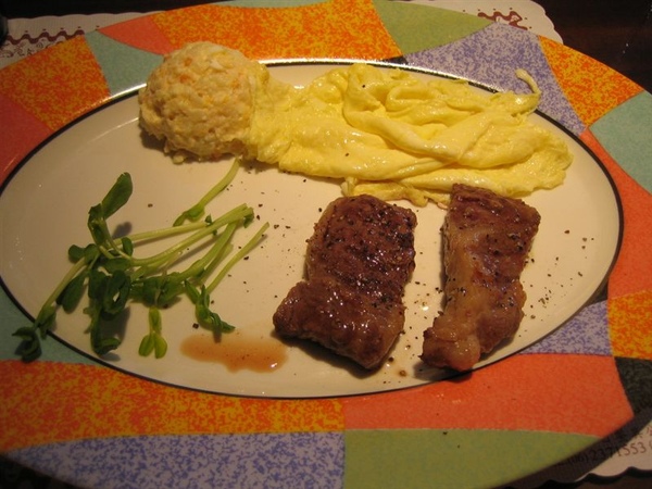 跟別間brunch比較不一樣的是主菜,選擇有:奶香杏鮑菇,鹽燒松阪豬,鹽烤牛小排,香煎鱈魚